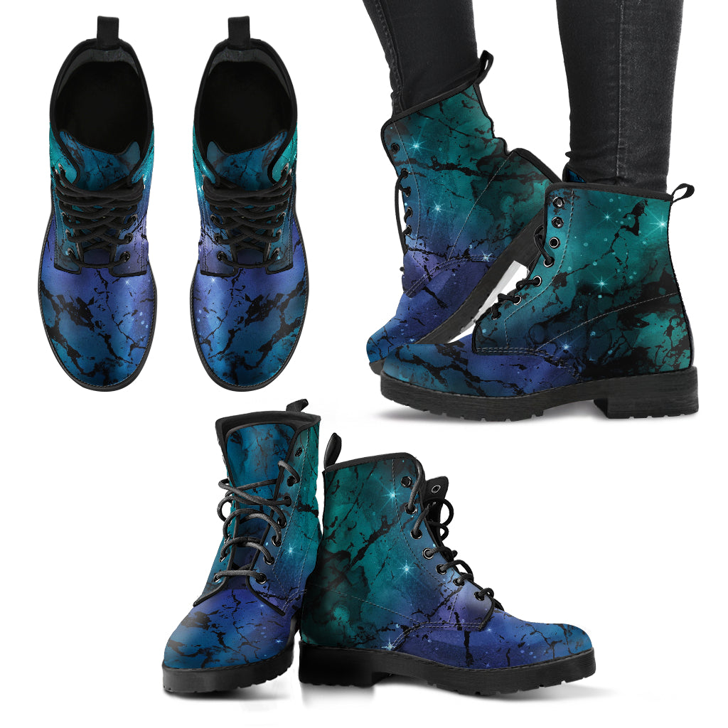 - Features vegan-friendly leather with a double-sided print and rounded toe construction.